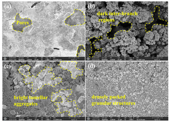 During electrical contact, the high-temperature arc between movable and stationary contacts causes metal melting and droplet splashing, leading to surface erosion of AgSnO2. Figure 15 depicts SEM scans (5000X magnification) of the erosion features on the anode contacts before and after doping. Figure 15a shows that the undoped material surface exhibits large pores and traces of molten metal flow. This originates from the significantly higher oxygen solubility in liquid silver compared to solid silver. Oxygen absorbed by molten silver under arc action partially escapes due to the sudden pressure drop upon contact separation. Residual oxygen trapped during rapid solidification forms pores, degrading electrical contact performance.