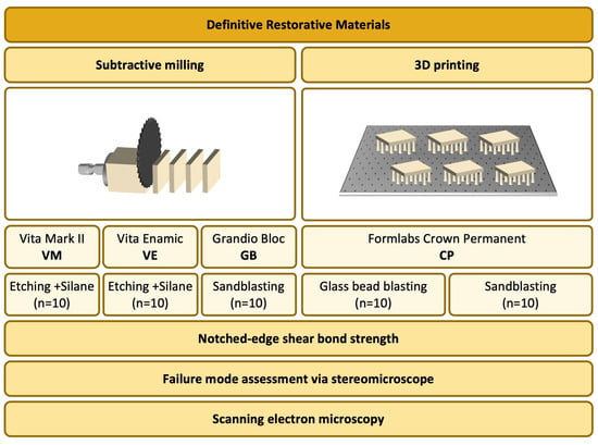 - Mao, Z.; Schmidt, F.; Beuer, F.; Yassine, J.; Hey, J.; Prause, E. Effect of surface treatment strategies on bond strength of additively and subtractively manufactured hybrid materials for permanent crowns. Clin. Oral Investig. 2024, 28, 371. [Google Scholar] [CrossRef] [PubMed]