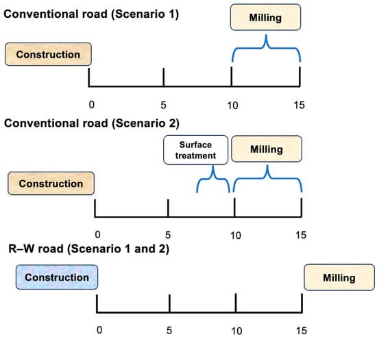 Scenario 1: Equal Service Life Assumption. In this scenario, both the conventional and R-W pavements are assumed to have the same total service life of 15 years. However, the timing and frequency of maintenance differ. The conventional pavement undergoes milling and resurfacing at multiple points during its lifespan—specifically, at years 10, 13, and 15—depending on the maintenance scenario analyzed. In contrast, the R-W pavement is assumed to require only a single milling operation at year 15, with no intermediate treatments. This scenario provides a conservative comparison in which durability is held constant, but differences in maintenance frequency are still considered.