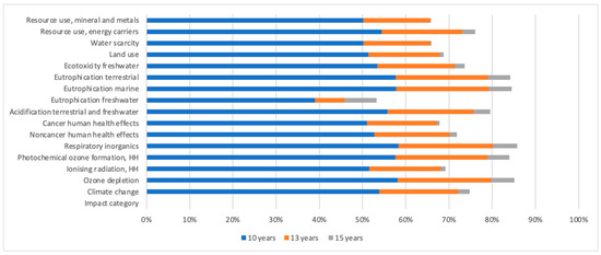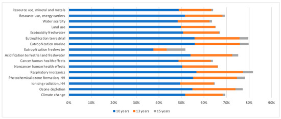 Figure 4 and Figure 5 illustrate the percentage reductions in environmental impacts achieved by the R-W road compared to the conventional pavement for each ILCD 2011 midpoint impact category. The results are presented for three different time horizons, 10, 13, and 15 years, reflecting the service-life scenarios assessed in Table 3 and Table 4.