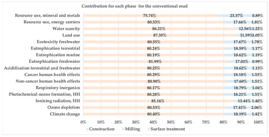 For the conventional pavement (Figure 6), the milling phase contributes significantly to several categories, including resource use (minerals and metals) and climate change, accounting for up to 23% of the impact. Surface treatment, in contrast, shows a minimal contribution across all categories (generally under 2%), confirming its low environmental relevance.