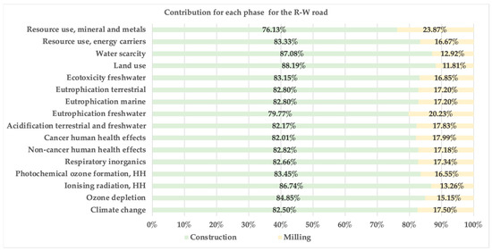 Contributions of each life cycle phase to the total environmental impacts of the R-W road.