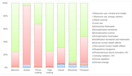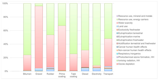 In both pavement alternatives, bitumen and diesel consumption emerge as the dominant contributors to several impact categories, particularly climate change, human toxicity, and resource depletion. This is consistent with their energy-intensive production processes and high carbon intensity. For the conventional pavement (Figure 8), bitumen, gravel, and diesel account for a substantial share of the impacts in categories such as land use, water scarcity, and acidification.