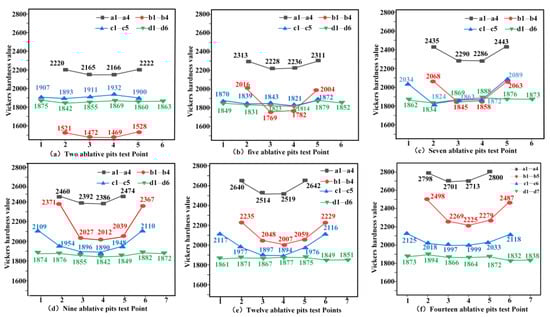 Figure 5a shows the hardness evolution in Zone a with the number of laser ablations. It is evident that hardness continuously increases with the number of ablations. In Zone a, the hardness distributions of a1 and a4, as well as a2 and a3, exhibit symmetrical distribution about the pit centerline, with higher hardness at peripheries than at the center. As the number of ablations increases, Figure 5b reveals progressive convergence of the a1–a4 and a2–a3 hardness curves. The average hardness in Zone a demonstrates a steady upward trend with ablation times, with a 28.05% increase in average hardness observed after 14 ablations compared with the first ablation.