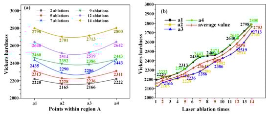 Hardness variation curve of Zone a with ablation times. (a) Hardness evolution at the different position points, (b) Hardness evolution at the same position point.