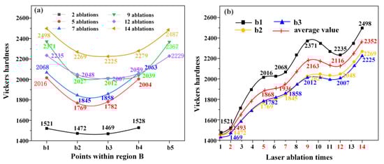 Hardness variation curve of Zone b with ablation times. (a) Hardness evolution at the different position points, (b) Hardness evolution at the same position point.