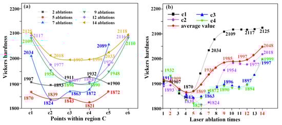 Hardness variation curve of Zone c with ablation times. (a) Hardness evolution at the different position points, (b) Hardness evolution at the same position point.