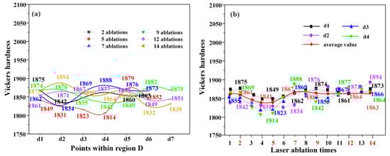 Hardness variation curve of Zone d with ablation times. (a) Hardness evolution at the different position points, (b) Hardness evolution a at the same position point.