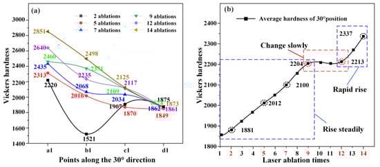 Hardness of 30° position with the number of laser ablations. (a) Hardness evolution in the 30° direction, (b) Average hardness of 30° position.