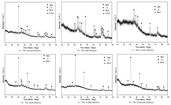 Figure 13 presents the XRD phase analysis of cross-sectional affected zones in liquid-phase ablated cemented carbide. After 2–5 laser ablations, the phase components include carbon (C), tungsten carbide (WC), W2C, and cobalt carbide (Co2C). Compared with the unablated substrate, laser ablation generates W2C and Co2C, confirming laser-induced phase transformations. After 7 to 14 ablations, the phase components include C, WC, and W2C, with Co2C disappearing under prolonged high-temperature ablation compared with 2–5 ablations.