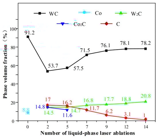 Figure 14 illustrates the evolution of phase volume fractions versus laser ablation times. Initially, the WC content decreases from 91.2% (unablated) to 53.7%, then gradually recovers, stabilizing at ablations 12–14. Cobalt (Co) presents only in unabated state, constituting 8.8% of the material. W2C forms through physicochemical reactions, increasing progressively with ablations. Its high hardness directly contributes to overall hardening. Co2C appears at the initial ablation and is further decomposed into finer Co with increased laser energy, which improves the cemented carbide’ s hardness. C declines steadily to 1% with the number of ablations, promoting the combination of W and C and bulk material stabilization.