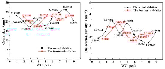 Figure 15 compares grain structures and dislocation density after 2 and 14 laser ablations. It is evident that after 14 ablations, reduced fluctuation ranges in grain size and dislocation and a more uniform distribution compared with 2 ablations, indicating greater stability. XRD phase analysis reveals that the material produced after 2 ablations differs from that produced after 14 ablations. The initial products from 2 ablations include carbon, tungsten carbide, ditungsten carbide, and cobalt carbide, while the products after 14 ablations include carbon, tungsten carbide, and ditungsten carbide, with cobalt carbide missing. The result suggests that cobalt, present in a lower content compared with tungsten, partially reacts under high-temperature processing. As the laser energy increases, tungsten grains become further refined and more uniformly distributed, better adhesion and thereby improving the hardness of the material.