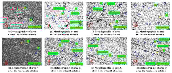 When the ablation time reached 14 times, as shown in Figure 16e, it was observed that α and β fused together in region A, covering a wide range, distributed evenly, and extremely abundant, and its hardness gradually increased with the fusion process of α and β phases. In Figure 16f,g, microcracks are clearly visible, and the β phase is partially melted but not completely lost, while the α phase undergoes refinement; in Figure 16h, microcracks are less severe than in other regions, and the β phase is less abundant.