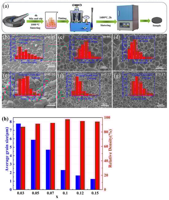 (a) Sample sintering process diagram; (b–g) the surface images of the (1−x)BCT−xBLZ ceramics at x = 0.03–0.15; and (h) the average grain size and relative density of samples.