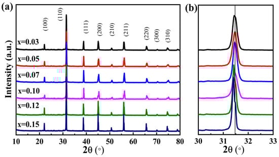 XRD patterns of (1−x)BCT−xBLZ ceramics over 2θ of (a) 10–80°; and (b) 30–33°.