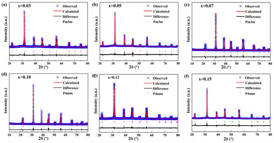 Rietveld refined XRD patterns of (1−x)BCT−xBLZ ceramics. (a) x = 0.03; (b) x = 0.05; (c) x = 0.07; (d) d = 0.10; (e) x = 0.12; (f) x = 0.15.
