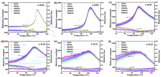 (a–f) The dielectric temperature spectra of (1−x)BCT−xBLZ ceramics with x = 0.03–0.15.
