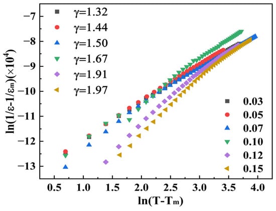 To further investigate the relaxation performance, a modified Curie–Weiss law can be employed: 1/ɛ − 1/ɛm = (T − Tm)γ /C (T > Tm), where γ, εm, and C represent the exponent that describes the degree of relaxation, the maximum permittivity at temperature Tm, and the Curie-like constant, respectively. The values of γ are 1.24, 1.41, 1.54, 1.78, 1.85, and 1.96 for the samples with x = 0.03–0.15, respectively, as shown in Figure 6. Incorporating BLZ introduces aliovalent ions and an ionic size mismatch into the host lattice, which serves to break down the long-range ordered ferroelectric domains. This process promotes the nucleation of finer nanodomains, a structural evolution that is crucial for enhancing the energy storage performance.