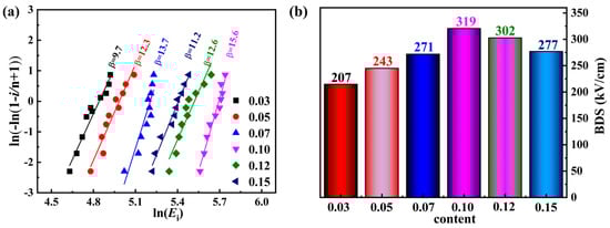 Weibull distribution is a better means to further evaluate the value of BDS. The BDS characteristic of the (1−x)BCT−xBLZ ceramics can be defined as follows [,]: