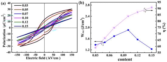Figure 8a shows P-E curves of the (1−x)BCT−xBLZ (x = 0.03–0.15) ceramics at 150 kV/cm. The increasing width of the P-E loops at higher field strengths points to a hindered back-switching of polar nano domains (PNRs), a process that requires a greater electric field to actuate during loading and unloading. All samples exhibit quasi-rectangular single P-E hysteresis loops. With increasing applied field amplitude, the loops systematically broaden, signifying greater energy dissipation during the polarization reversal cycle. This increased hysteresis loss is ascribed to the field-dependent dynamics of nanodomain switching. At higher electric fields, domain walls more readily overcome pinning barriers, but their motion and reorientation result in more significant energy dissipation, leading to the observed widening of the P-E loop. Meanwhile, with increasing x, the Pmax decrease from 30.8 μC/cm2 (x = 0) to 15.7 μC/cm2 (x = 0.15) is mainly caused by the electrically induced short-range ordered relaxation nanodomains returning to long-range disordered ferroelectric domains after the removal of the electric field []. The Wrec and ƞ as a function of BLZ are shown in Figure 8b. The Wrec remarkably increases from 1.38 J/cm3 (x = 0.03) to the maximum value of 1.91 J/cm3 (x = 0.10), and then decreases to 1.13 J/cm3 (x = 0.15). It is attributed that Li+ and Zr4+ at the B-position in the body-centered position of the crystal will reduce the distance between the B-position and oxygen ions, which greatly affects the conduction behavior of electrons in the ceramic, resulting in increasing storage density. Meanwhile, the η of the samples increases from 58.95% (x = 0.03) to the maximum value of 90.87% (x = 0.15), which suggests that Bi3+-Bi3+ ion pairs are formed by the introduction of Bi ions at the A position. The 6p orbital of Bi3+-Bi3+ ion pairs and the 2p orbital of O2− ion are hybridized, which leads to the thinning of the hysteresis loop, thus obtaining higher energy storage efficiency [,]. For performance evaluation, the energy storage density and efficiency, along with corresponding electric field of the (1−x)BCT−xBLZ ceramics, are benchmarked against other lead-free materials in Table 2. It is evident from this comparison that the present ceramic system shows a superior energy storage capability, a distinction that is particularly noteworthy given that it is achieved at a low electric field.