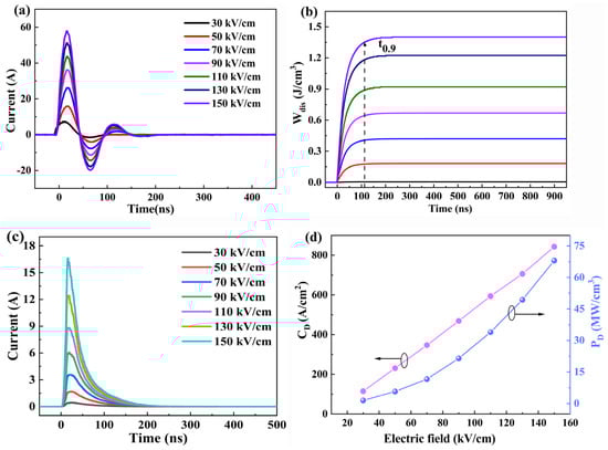 where CD, PD, Wd, Imax, E, S, R, and V are the discharge current, power density, discharge energy storage, maximum current, electric field, electrode area, load resistance (200 Ω), and sample volume, respectively. Figure 9a displays the underdamped pulse discharge profiles under various applied electric fields. It is observed that while the fundamental waveform shape remains consistent, the peak current (Imax) increases substantially from 10.3 A to 57.8 A as the electric field rises from 30 kV/cm to 150 kV/cm. The corresponding Wdis with the applied electric field is presented in Figure 9b. The Wdis exhibits a monotonic increase with the field strength, reaching a maximum value of approximately 1.47 J/cm3 at the highest tested field of 150 kV/cm, with a relatively long discharge time (t0.9) of 109 ns. Notably, the maximum discharged energy density (Wdis = 1.47 J/cm3) obtained from the pulse test is lower than the recoverable energy storage density (Wrec = 1.91 J/cm3) calculated from the P-E loop. This discrepancy is primarily attributed to energy dissipation within the system, which includes losses from the equivalent series resistance (ESR) of the charge–discharge circuit and increased energy dissipation due to the viscous drag on domain walls during their rapid motion. Furthermore, the load resistor in a practical application introduces an additional pathway for energy loss. Therefore, while Wrec represents an idealized storage capacity, Wdis provides a more practical measure of the effective discharged energy density relevant to real-world applications. Figure 9c shows the overdamped pulse discharge profiles for the same composition (x = 0.10), which exhibit similar discharge behaviors where the peak current grows with the applied field. From these measurements, the current density (CD) and power density (PD) were calculated and are plotted against the electric field in Figure 9d. Both CD and PD increase progressively with the field strength, attaining impressive maximum values of 871 A/cm2 and 67.3 MW/cm3, respectively, at 150 kV/cm. This high performance is enabled by the material’s high polarization and rapid energy release. These excellent charge–discharge characteristics affirm the significant potential of the 0.9BCT-0.1BLZ ceramic for pulse power capacitor applications.