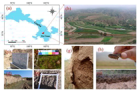 The sampling site was located in Weiyuan County, Gansu Province, China, in the section of Majiashan Village of the Warring States, Qin Great Wall, and the focus of the research is focusing on the Great Wall made with rammed soils (as a building material), (103°44′–104°20′ E, 34°53′–35°25′ N, elevation 2264.1 m, Figure 1), which is a typical loess landform area. Weiyuan County is located in the central part of Gansu Province, with a temperate continental monsoon climate, with rainfall mainly concentrated in July to October, and an average annual precipitation of about 600 mm, and an annual temperature of 10–12 °C.