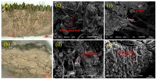 Digital microscope and scanning electron microscope images of different types of biocrusts. Digital microscope: moss crust ×50 (a), cyanobacterial-lichen crust ×50 (b); Scanning electron microscopy: moss crust ×50 stem and leaf (c), moss crust ×400 (d), cyanobacterial-lichen crust ×80 fiber (e) and bare soil ×1000 (f).