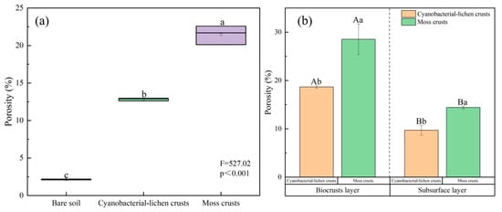 Porosity of bare soil, cyanobacterial-lichen crusts and moss crusts. Total porosity of the entire soil column (a), porosity of the biocrusts layer and subsurface layers of the biocrusts (b). Different lowercase letters (a and b) indicate significant differences in the porosity of different soil types in the same soil column (p < 0.05). Different uppercase letters (A and B) indicate significant differences in porosity between the biocrusts layer and subsurface layers of the same type of soil (p < 0.05).