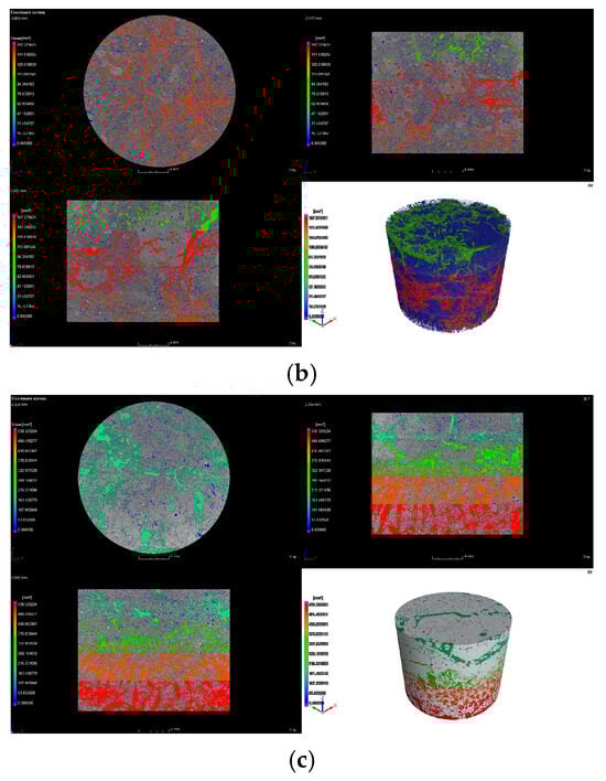 Due to the limitation of CT scanning resolution, the following pores all refer to the pores with equivalent diameter greater than 50 μm, therefore, there is a difference between the actual soil porosity and the actual soil porosity [28]. As shown in Figure 3a, the porosity of all three soil types showed moss crust > cyanobacterial-lichen crust > bare soil in the 0–50 mm depth range (p < 0.05), with the porosity of cyanobacterial-lichen crust and moss crust of 12.84% and 21.47%, respectively, 5 times and 9.03 times higher than bare soil (2.14%). The porosity of the biocrusts samples was significantly higher in the biocrusts layer than in the subsurface layers, and the porosity of the subsurface layers of cyanobacterial-lichen crust and moss crust was significantly lower than that of the biocrusts layer by 92.54% and 97.96%, respectively (p < 0.05), and the porosity of the moss crust was significantly higher than that of the cyanobacterial-lichen crust in all the same layers (p < 0.05) (Figure 3b).