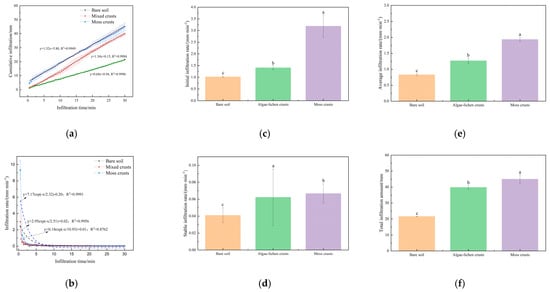 Water infiltration characteristics. Cumulative infiltration (a), infiltration rate (b), initial infiltration rate (c), stable infiltration rate (d), average infiltration rate (e) and total infiltration (f) of biocrusts and bare soil.