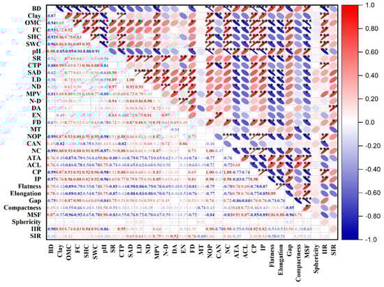 Pearson correlation coefficients matrix of bulk density (BD), clay (Clay), organic matter content (OMC), field capacity (FC), saturated hydraulic conductivity (SHC), saturated water content (SWC), pH, surface roughness (SR), CT porosity (CTP), surface area density (SAD), length density (LD), network density (ND), mean pore volume (MPV), node density (N-D), degree of anisotropy (DA), Euler number (EN), fractal dimension (FD), mean tortuosity (MT), number of node pores (NOP), average coordination number (CAN), number of channels (NC), average throat area (ATA), average channel length (ACL), connected porosity (CP), isolated porosity (IP), flatness (Flatness), elongation (Elongation), gap (Gap), compactness (Compactness), mean shape factor (MSF), sphericity (Sphericity), initial infiltration rate (IIR), stabilised infiltration rate (SIR). Correlation coefficients are listed in the lower left corner of the matrix and significance is listed in the upper right corner, with red indicating positive correlation and blue indicating negative correlation. *, **, *** represent p ≤ 0.05, p≤ 0.01, p ≤ 0.001 respectively.