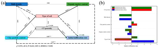 Path analyses (a) and effect plots (b) of changes in initial soil infiltration rates and their main influencing factors.
