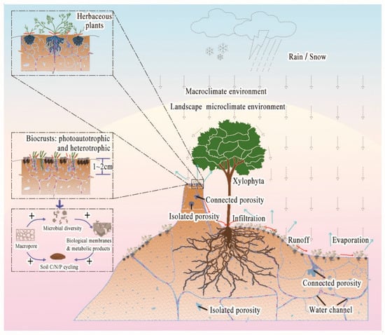 - Li, S.; Bowker, M.A.; Xiao, B. Biocrust impacts on dryland soil water balance: A path toward the whole picture. Glob. Change Biol. 2022, 28, 6462–6481. [Google Scholar] [CrossRef]