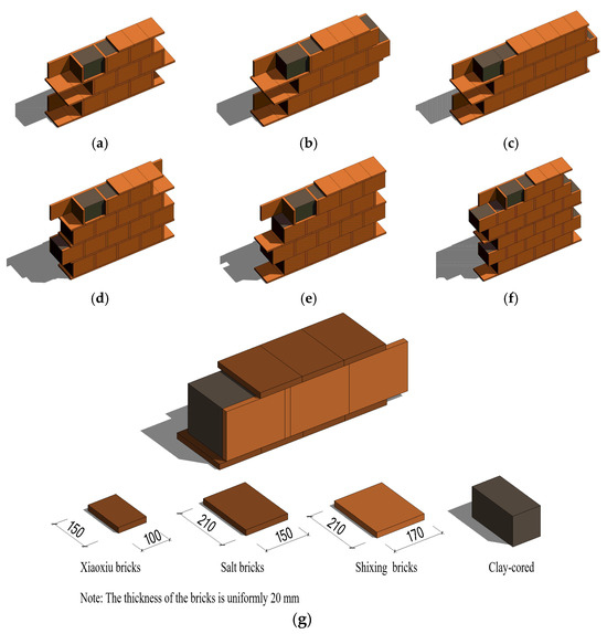 The masonry method and size of BCWs. (a) Ding-and-shun. (b) Ding-and-double-shun. (c) Ding-and-triple-shun. (d) Mian-one-dou. (e) Mian-and-double-dou. (f) Mian-and-triple-dou. (g) Size specifications of red bricks (chart source: Revit 2022. Produced by Autodesk, San Francisco, CA, USA).