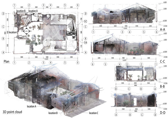 Figure 3. Sampling point identification diagram of Ding Gongchen’s former residence. Note that, due to the fact that the area is a no-fly zone, it was not possible to use drones for aerial photography (chart source: we obtained point cloud data by the XGRIDS Lixel L 3D laser scanner (Produced by Shenzhen Qiyu Innovation Technology Co., Ltd., Shenzhen City, China) and then imported the point cloud data into Revit 2022 for layout and annotation). - (2)