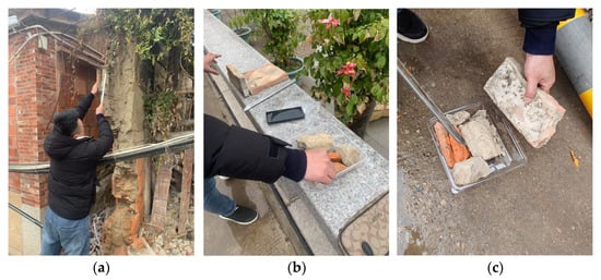 - The north mountain wall of the sample building shows three different states of BCW: (A) fully preserved wall, (B) wall damaged due to years of disrepair, and (C) a temporary reinforced wall completed in 1991. According to the principle of “recognizability” in the protection and restoration of ancient architecture, contemporary crafts and materials can be compared, distinguished, and excluded based on the current situation of point (C), in order to accurately identify the crafts and materials of points (A) and (B), which is a traditional practice in the Qing Dynasty of China [19] (Figure 3, Figure 4 and Figure 5).