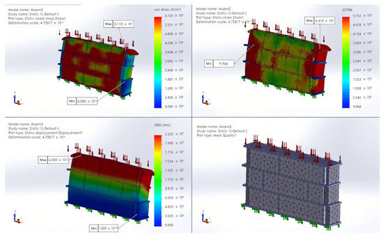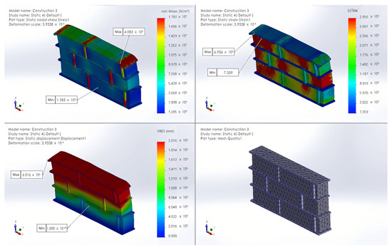 Using SOLIDWORKS 2024 (SW. software is produced by Dassault Systemes company, Concord, MA, USA) software, finite element mechanics (FEM) simulation analysis was conducted on three structural samples of the BCW (Figure 6, Figure 7 and Figure 8). The analysis utilized triangular meshes with an element size of 35 mm, as set within the software. The sample models were created using Revit 2022, with boundary conditions ranging from approximately 1 m3 to 1.5 m3 (710 mm × 970 mm × 210 mm), and the Revit model data were then converted to the IFC format for importation into SW.