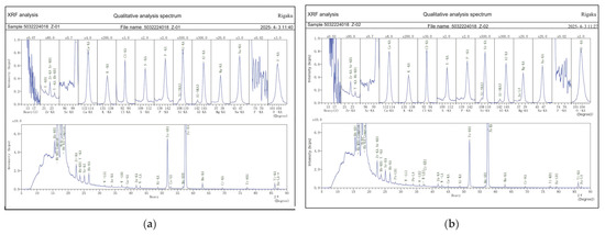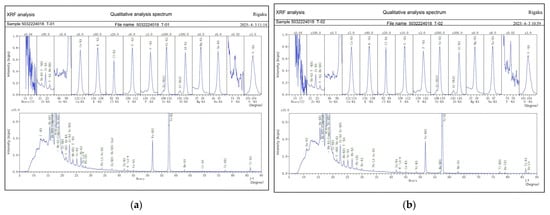 X-ray fluorescence (XRF) diffraction to red brick patterns: (a) Z-01 XRF diffraction pattern; (b) Z-02 XRF diffraction pattern. (Chart source: XRF chemical composition detection experiment.)