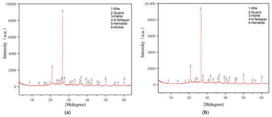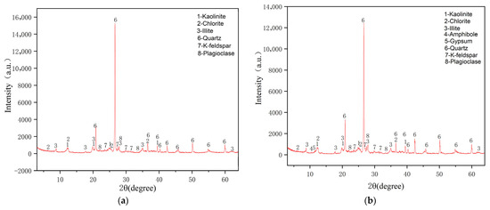 JADE 9 (Produced by Materials Data Inc., Livermore, CA, USA) software was used for mineral composition analysis, while Origin software was used to generate diffraction peak patterns. For qualitative phase analysis, a powder diffraction database was utilized for both manual and computer retrieval, enabling the identification of matching phases from the database (PDF cards compiled and published by the International Centre for Diffraction Data, which contain standard powder diffraction spectra for various phases) [22].
