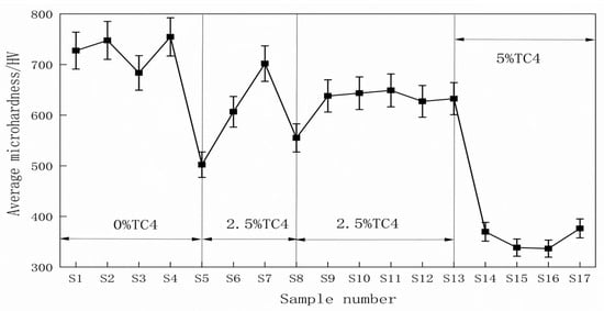 The surface hardness of a coating serves as a critical indicator for evaluating a material’s resistance to localized plastic deformation. Materials with higher hardness typically possess finer and more homogeneous microstructures, which contribute to enhanced corrosion resistance [18,19,20]. This improved hardness prevents the formation of wear-induced surface defects, thereby eliminating potential sites for corrosive media accumulation and long-term degradation. The surface hardness of the coating is determined using an HV-1000Z-type(Dongguan Kedi Instrument Co., Ltd., Dongguan, Guangdong, China) Vickers hardness tester, with an applied force of 30 N, a holding time of 10 s, and an interval of 0.2 mm, with a total of six points measured to determine the average value. Figure 3 shows the average microhardness of each sample, and the values are shown in Table 3, from which it is observed that, with the increase in TC4 addition, the overall hardness of the coating shows a decreasing trend. This is because the hardness of the TC4 material itself is lower than that of the AISI431 martensitic stainless steel. Additionally, the opposite result is observed in individual samples, such as S3 and S7, which indicates that the other process parameters (laser power and scanning speed) also have an influence on the hardness factor. Therefore, by increasing the amount of corrosion-resistant TC4 added to the coating, it is possible to optimize the process parameters in order to maintain a certain hardness value, thereby improving the corrosion resistance of the coating.