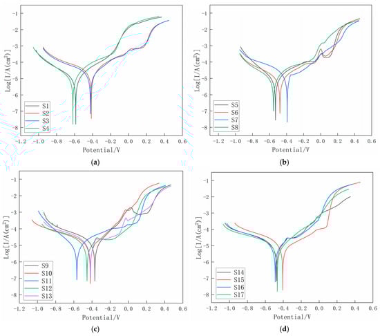 A three-electrode system electrochemical workstation, model CHI660f (Shanghai Chenhua Instrument Co., Ltd., Yangpu District, Shanghai, China), was employed. The reference electrode was a saturated calomel electrode, the auxiliary electrode was a platinum sheet electrode, and the measurement solution was sodium chloride with a mass fraction of 3.5%. The sample was welded with copper wires and epoxy resin sealing, which revealed the surface of the test coatings. An ohmmeter was used to measure the conductivity of the test surface and the copper wire between the test surface, as well as to determine whether the conductor was conductive before electrochemical testing. During the test, the sample was immersed in the solution until the open-circuit voltage was stabilized, with a scanning voltage range of ±0.7 V, a sampling frequency of 10 Hz, and a scanning speed of 1 mV/s. Figure 4 shows the polarization curves of the samples. The self-corrosive current density (Icorr), self-corrosive potential (Ecorr), and polarization resistance (RP) could be obtained via extrapolation of the Tafel method. The self-corrosive potential is the horizontal coordinate, and the self-corrosion current density is the vertical coordinate. The polarization resistance formula is shown in Equation (1) [21,22,23]: