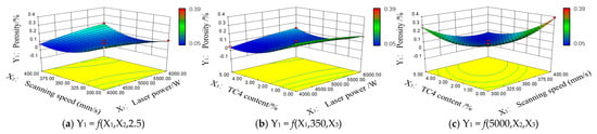 Effects of significant factor interactions (X1X2, X1X3, X2X3, p < 0.05) on porosity development: (a) Fixed 2.5% TC4; (b) Fixed scanning speed of 350 mm/s; (c) Fixed laser power of 5000 W.