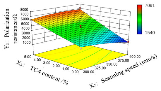 As shown in Figure 7, the optimum value of Y3 is obtained when the laser power is 5000 W, the scanning speed is slow, and the TC4 addition is large. When the TC4 content is fixed, Y3 decreases with an increase in the scanning speed. When the scanning speed is fixed, Y3 increases with an increase in the TC4 content. Because TC4 is a good corrosion-resistant material, in which Ti and Al elements can form a dense oxide film on the material surface to improve the polarization resistance, a lower scanning speed and powder addition will increase the coating intake ratio during fusion coating.