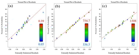 Residual normal distribution plot of the response target: (a) porosity; (b) average microhardness; (c) polarization resistance.