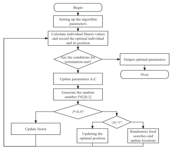 where t is the number of previous iterations; D is the distance vector between the current whale and a random whale; x(t) is the position vector; x(t) is the position vector of the best solution obtained so far; and A and C are the coefficients, with A = 2a(t) × r1(t) and C = 2r2(t). The convergence factor a decreases linearly from 2 to 0 throughout the iteration, and r1 and r2 are random vectors in [0,1].
