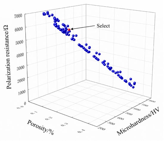 The initial population number is set to 100, and the iteration number is 500; Figure 10 shows the optimized Pareto solution set. The solution results in the following optimal parameter set: a laser power of 5315 W, a scanning speed of 378 mm/s, and a TC4 addition of 3.6%.