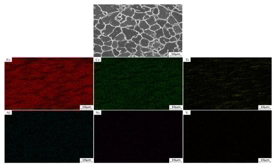 The surface of a coating serves as the functional working interface where wear and corrosion preferentially initiate. Accordingly, energy-dispersive X-ray spectroscopy (EDS) elemental mapping was conducted on the coatings’ surfaces to investigate their elemental composition distribution. The corresponding results are presented in Figure 11 and Table 5. The results indicate that Fe elements are predominantly concentrated within the dendrite cores, while Ti elements are mainly distributed in the interdendritic regions, with other elements exhibiting relatively uniform distribution. The elements that account for the largest proportion of the content, from highest to lowest, are Fe, Cr, and Ti. Among these, when the Cr and Ti elements come into contact with the air, CrO3 and TiO2 can form on the surface of the coatings, thereby creating a dual-layer antioxidant effect [27]. This is why corrosion resistance improves with the addition of TC4 material.