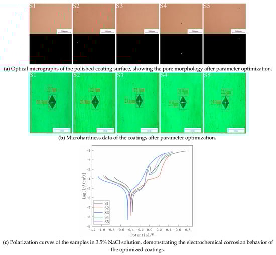 The results showed average values of 0.02% porosity, 714.72 HV hardness, and 12,762.4 Ω polarization resistance. Compared to the S1–17 controls with optimal parameters of 0.05% porosity, 754.7 HV hardness (without TC4), and 7091 Ω polarization resistance, the optimized parameters achieved a 60% reduction in porosity while maintaining hardness and increasing polarization resistance by 79.98%. TC4 addition improved corrosion resistance and reduced porosity, but concentrations exceeding 3.6% decreased hardness and increased porosity. Considering TC4’s high material cost, parameter optimization is essential for cost-effective performance enhancement of laser-clad coatings.