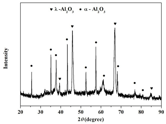 In this work, the degreased 304 stainless steel bars with the size of 5.0 mm × 70.0 mm × 1.0 mm and the γ-Al2O3 (Tianjin Kemiou Chemical Reagent Co., Ltd., Tianjin, China) were employed as the original crude materials. By using DH-2080 plasma spraying equipment (Shanghai Dahao Ruifa Thermal Spray Machinery Co., Ltd. Shanghai, China), Al2O3 coatings were deposited on one face (5.0 mm × 70.0 mm) of 304 stainless steel bars with different thickness of 0.2 mm, 0.7 mm and 1.0 mm, respectively. Consequently, the corresponding samples were noted as S1, S2 and S3, respectively. A mixture of argon and hydrogen was used as the plasma gas. And the detailed phase composition of Al2O3 coating deposited on 304 stainless steel bars was shown in Figure 1, which indicated that the main phases were α-Al2O3 and γ-Al2O3.