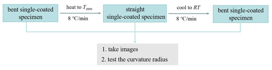 Thickness of the coating and the substrate of all specimens in this work was identified by VHX digital microscope. The morphology was studied by scanning electron microscopy (SEM, Merlin, Zeiss, Oberkochen, Germany). To record the deformations of samples at elevated temperatures, Visual in-situ Tester (TianJin ZhongHuan Electric Furnace Co., Ltd., Tianjin, China) coupled with photography technology was used. In the process of testing shown in Figure 2, samples were heat-treated with a heating rate of 8 °C/min. And then, they were cooled to the room temperature (RT) with the rate of 8 °C/min. Based on the photos of the specimens under different experimental conditions, the temperature dependence of curvature radius were obtained.